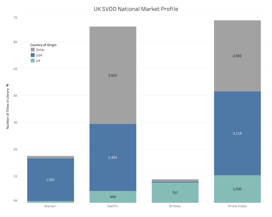 Domestic content is most widely available through ad-supported BVOD services. With reliance on ad-funding, such services make British content more accessible but do not contribute new content to the ecosystem. At the time of writing, it was unclear how Britbox would be incorporated into ITVX. A few niche services emphasizing domestic content also exist in the market though appear to have low adoption. AcornTV features a library with more than 60 percent British content and BFI Player is nearly entirely British-produced works.